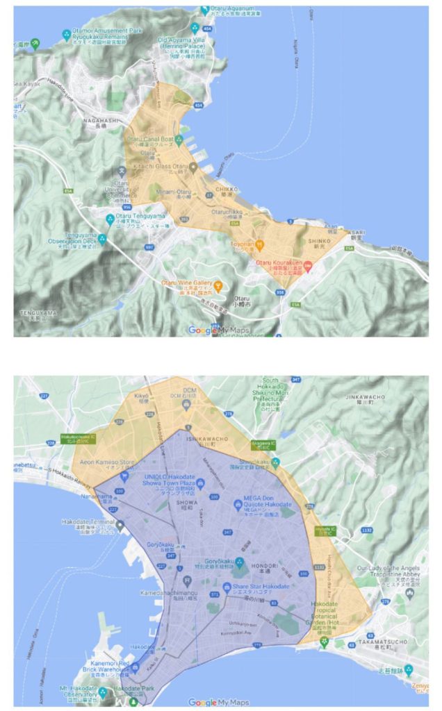 ▽小樽市(画像上)、函館市、北斗市(画像下)の対応マップ画像▽
