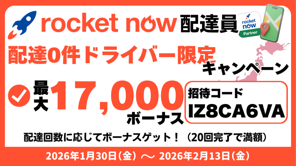 フードデリバリーサービス「ロケットナウ(Rocket Now)」にて、これから稼働を始めるドライバーの方に向けた、とんでもなくお得なキャンペーンが開催されています!