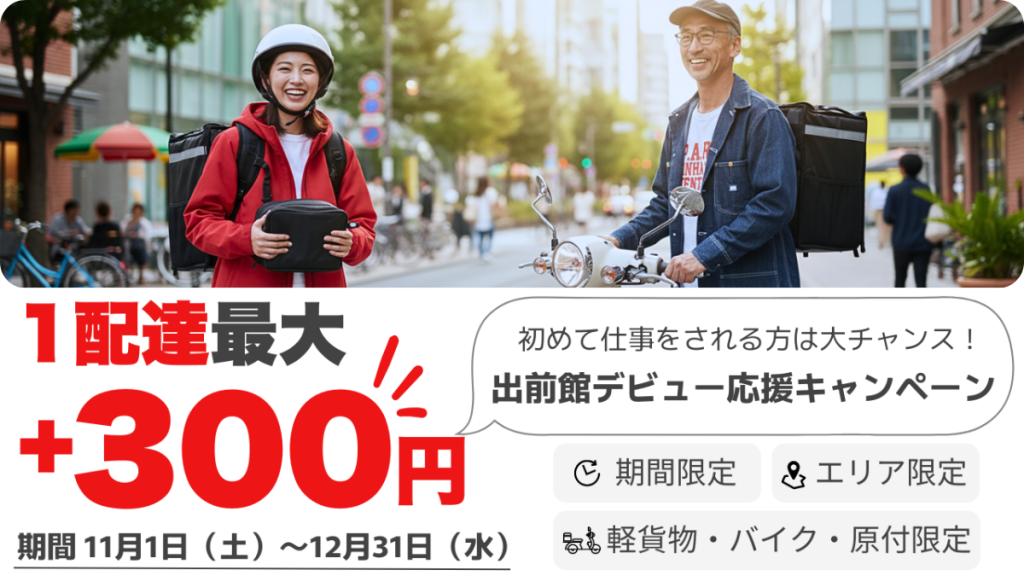「出前館デビュー応援キャンペーン」は、初めて出前館で配達の仕事をする方を対象とした、期間限定の報酬アップキャンペーンです。