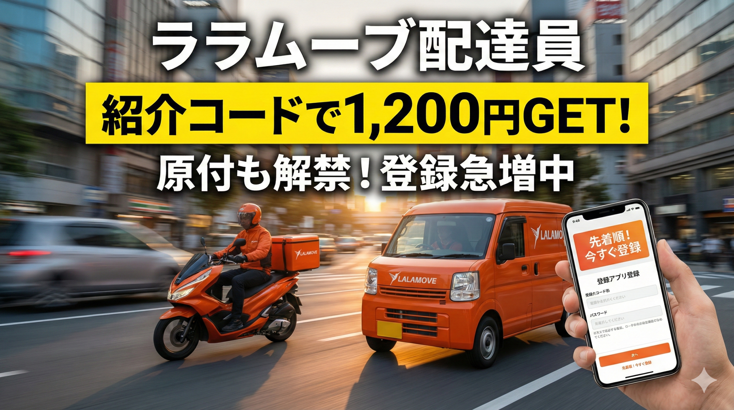 これまでの軽貨物配送に加え、ついに「原付バイク」での配達員登録も解禁!さらに今なら、このブログ限定のララムーブ配達員紹介コードを活用することで、最初の1件を完了するだけで「1,200円」の特別ボーナスが手に入ります。
