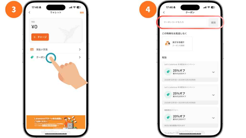 クーポンコードは、注文画面で入力するほか、あらかじめ「ウォレット」に登録しておくことでスムーズに利用できます。手順は以下の4ステップです。