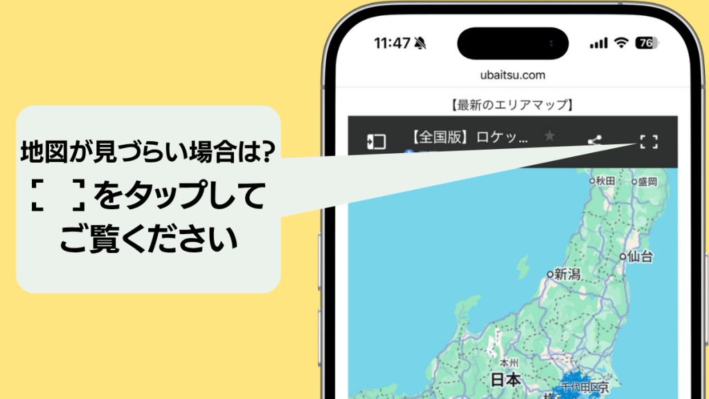 また、お使いのブラウザで地図が見づらい場合は、画面右上の [ ] マークをタップするとGoogleマップアプリ、またはブラウザの全画面でご確認いただけますので是非ご活用ください。