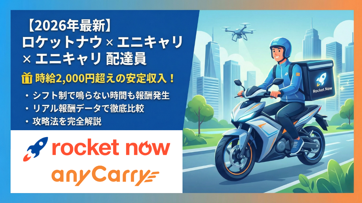 「Uber Eats が全然鳴らない」「待機時間だけで1日が終わってしまった…」 2026年、多くのギグワーカーが抱えるこの悩みを解決する「第3の働き方」として、今「ロケットナウ(Rocket Now)」の法人パートナー(エニキャリ契約)が注目を集めています。