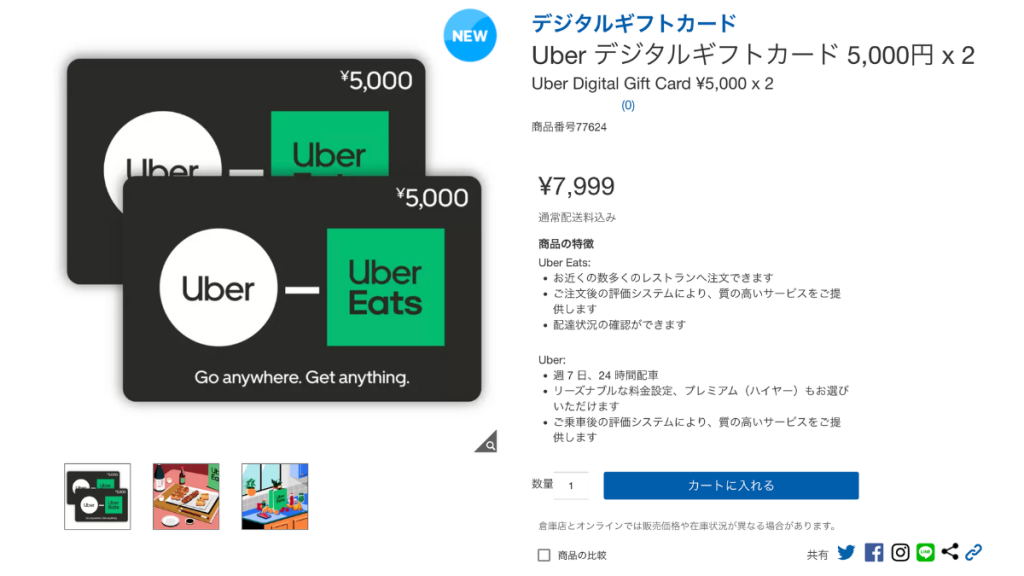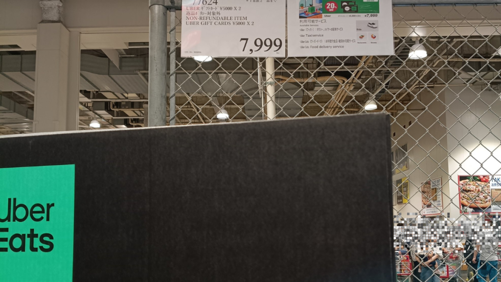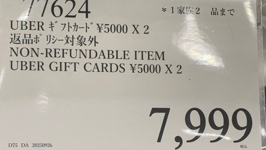 コストコのプリペイドカード売り場で、ひときわ目を引くのが「Uber ギフトカード」です。このカードの何が特別かというと、その驚くべき販売価格にあります。