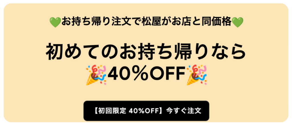 松屋の食券販売機より安く注文できる、衝撃のキャンペーンが始まりました!Uber Eats の「お持ち帰り」限定で、店頭価格からさらに40%割引になります。